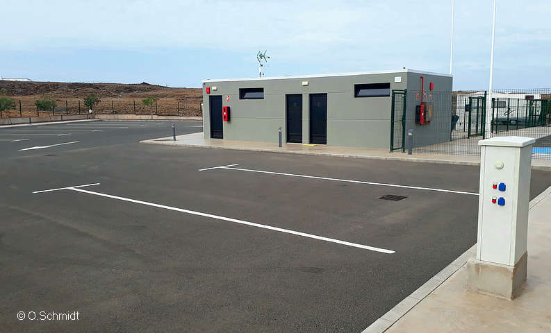 Besucher-Kommentar (16.11.2020): Nachdem ich hinter die Tankstelle gegangen bin, habe ich den Stellplatz entdeckt. Genau so neu angelegt wie die Tankstelle, aber privat betrieben. Komplett 2,40 m hoch umzäunt und mit Kameras ausgestattet. Sehr sauber, ca. 30 Stellplätze mit Stromanschlüssen. In der Mitte die Sanitäreinrichtungen. |