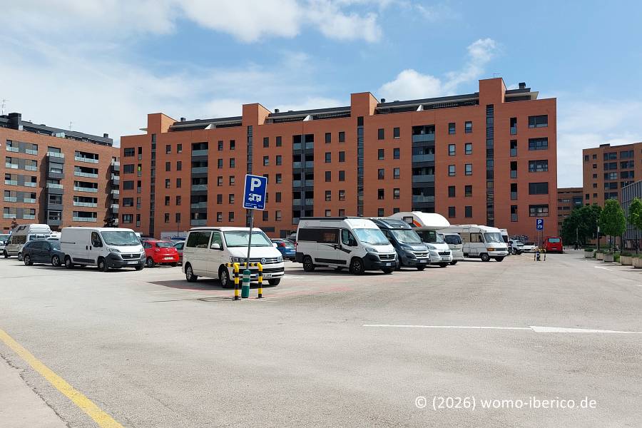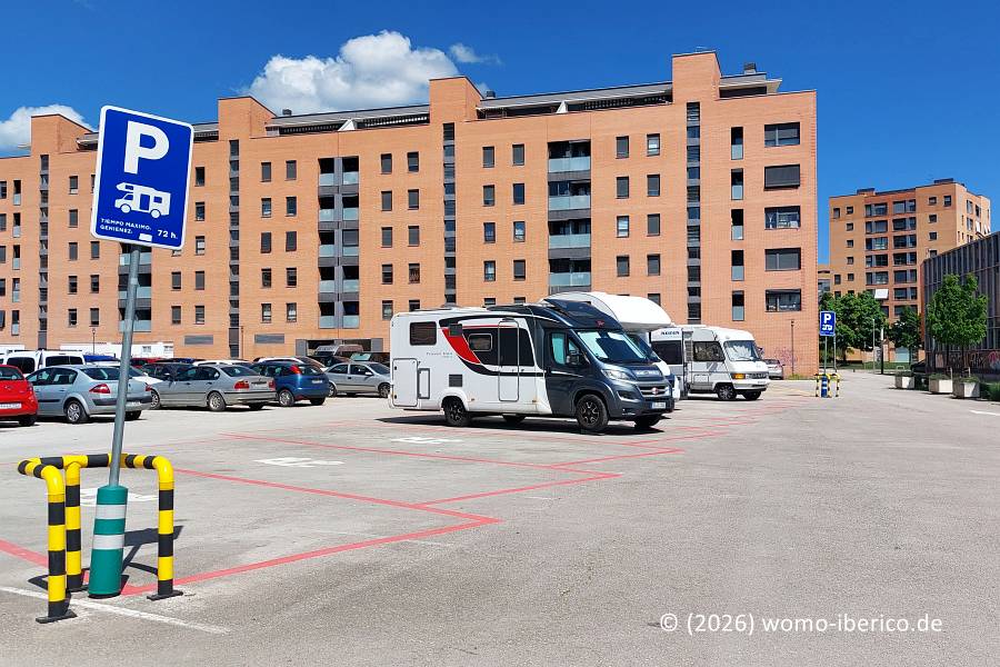 | Offizieller Stellplatz auf einem Teil eines allgemeinen Parkplatzes in einem Vorort von Pamplona, etwa 2 km von der Altstadt entfernt. Die maximal erlaubte Aufenthaltsdauer beträgt 72 Stunden. Während der Fiesta "San Fermín" (5.-15. Juli) ist der Stellplatz kostenpflichtig. |