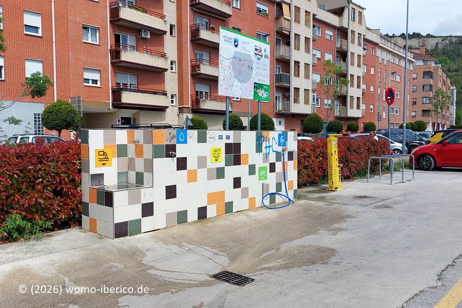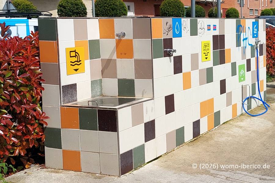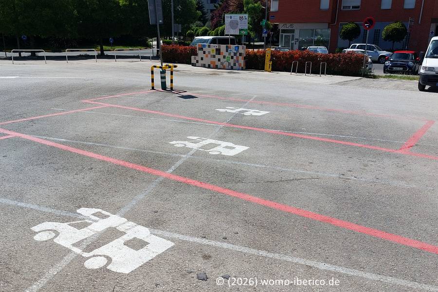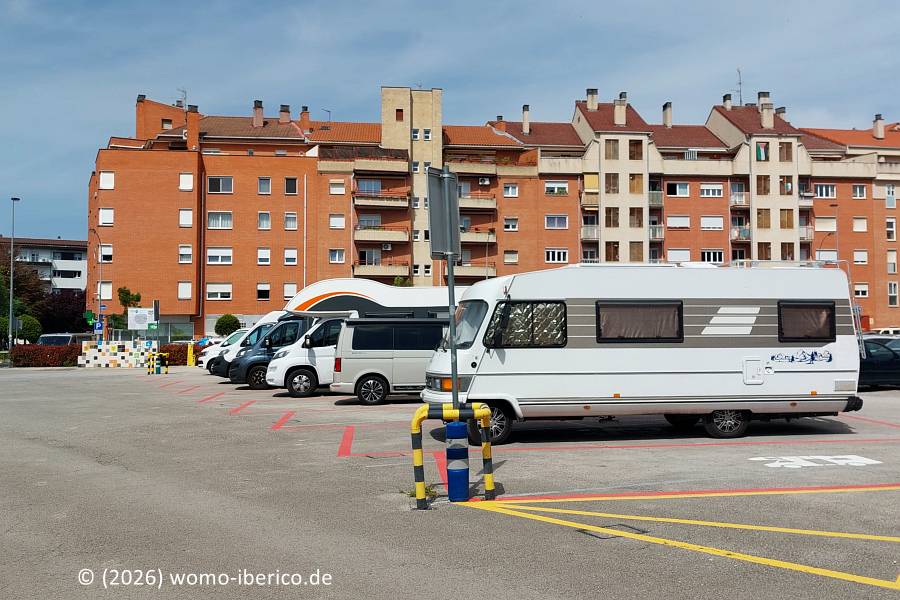 | Der Stellplatz ist für 9 Wohnmobile vorgesehen, und zwar nur auf den in roter Farbe gut markierten Parkbuchten neben der Ver- und Entsorgungsstation. Bei meinem Besuch an einem Wochenende war es nachts überraschend ruhig. Hinweis Laut Ordenanza Municipal (städt. Verordnung) kostet jeder angebrochene Tag während der Fiesta im Juli 8 €. Dafür entfällt in dieser Zeit das Aufenthaltslimit von 72 Stunden. Wie die Bezahlung erfolgen soll ist mir nicht bekannt. |