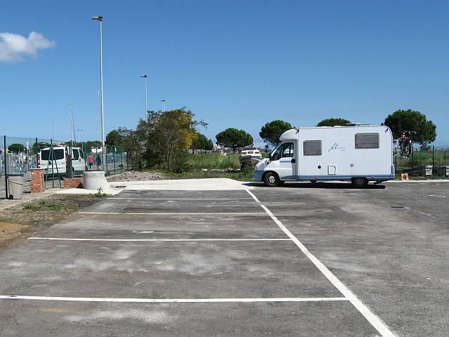 | Der Stellplatz ist zwar nicht schön, rundherum ist Hafengelände mit abgestellten Booten etc., aber er bietet eine gute Ver- und Entsorgung. Der Preis (2022) ist allerdings inzwischen auf 15 € pro Tag gestiegen, inklusive elektrischem Strom. |